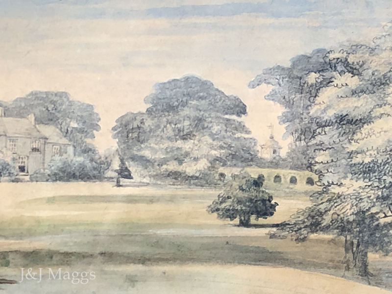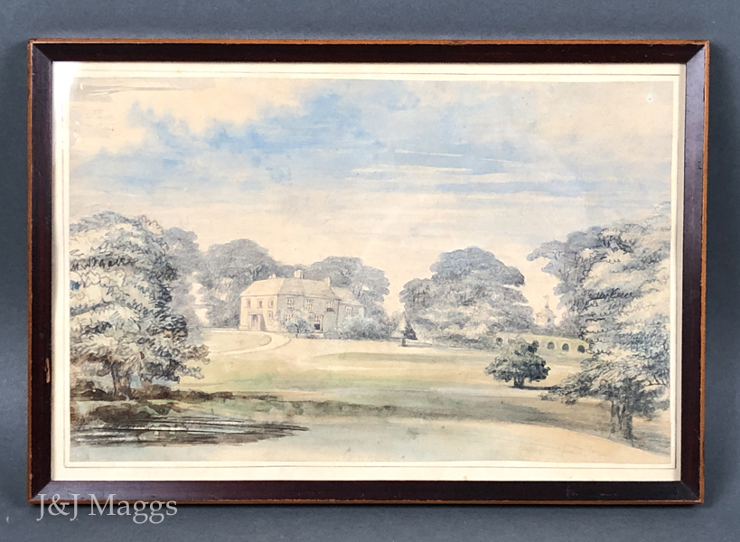 A pleasing work depicting a house in the countryside, approached by a circular drive. On the right is what appears to be an aqueduct, behind which is another building, perhaps a church or a barn.