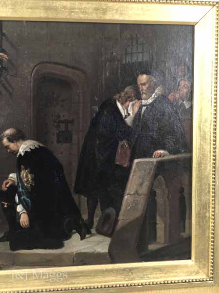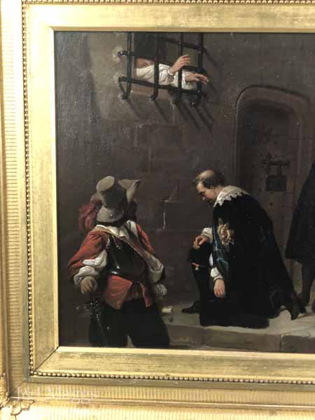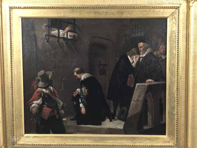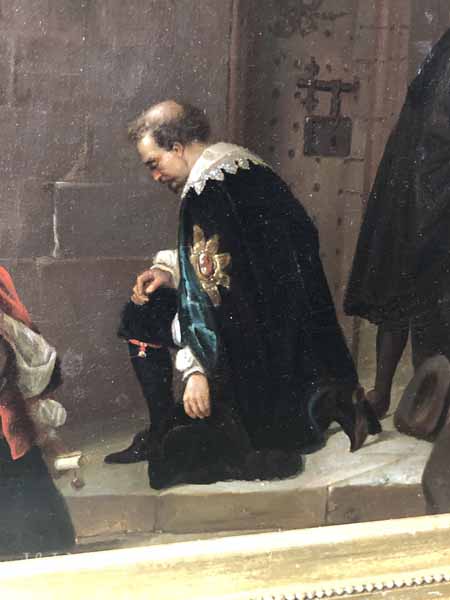 This painting, a copy of one by Paul Delaroche (1797 – 1856), may depict Henry’s agents delivering the verdict. The Duke is invisible to us but for his outstretched arms, and a man is seen wiping tears from his eyes. Only two members of the party are looking at the Duke: the man in red with sword in hand, has turned his head to look at the barred window, while on the far right, another, a sheriff perhaps, gazes vacantly at the window while eating a slice of bread. The central figure kneels, affirming the respect afforded the Duke by his subjects. The artist has captured the drama of this important moment.