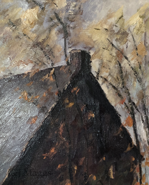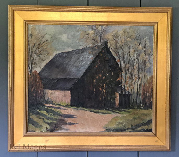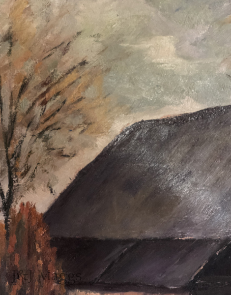 A solitary fall scene, with a stand of nearly bare trees encircling the large steep-roofed barn.