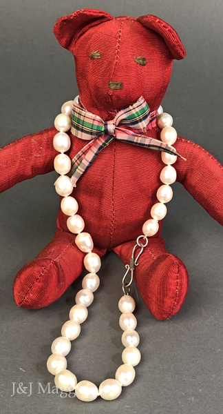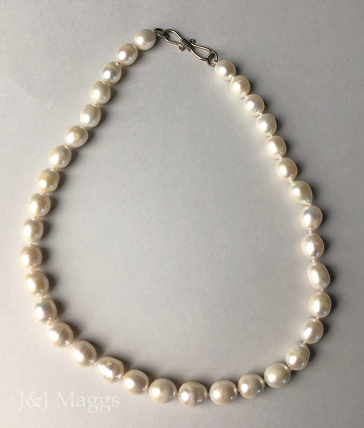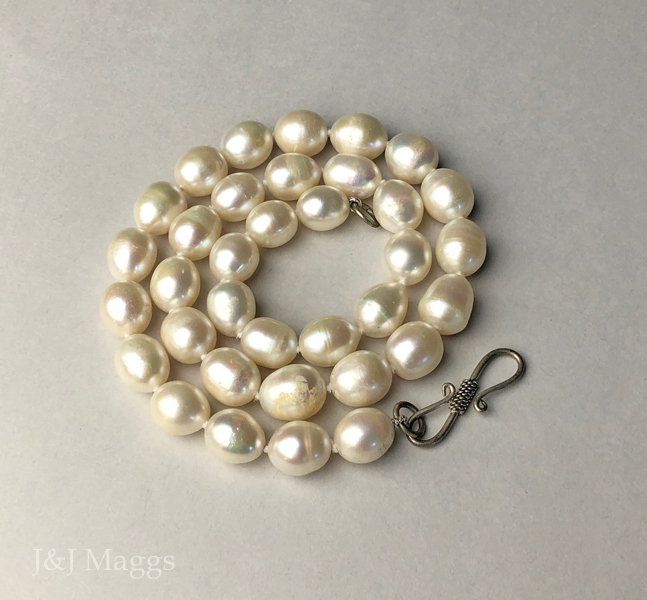 An 18 ½” strand of silk strung, white freshwater pearls in teardrop and oval shapes. The lustre is lovely and even. Joined with a fancy silver “S” hook and link clasp.