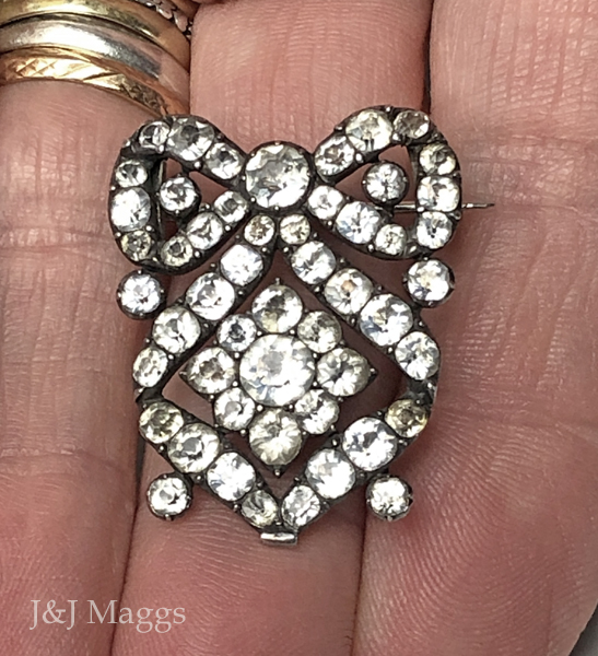 A silver bow-knot brooch closed set with black-dot diamond paste stones with a diamond shaped design centered below the bow. A later locking C-curl clasp on verso, 1” overall.