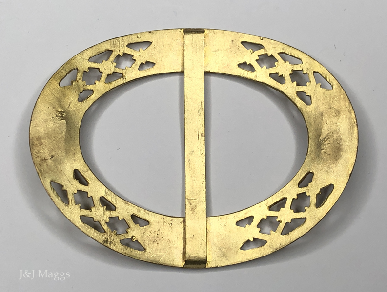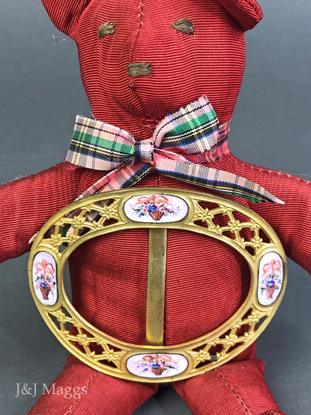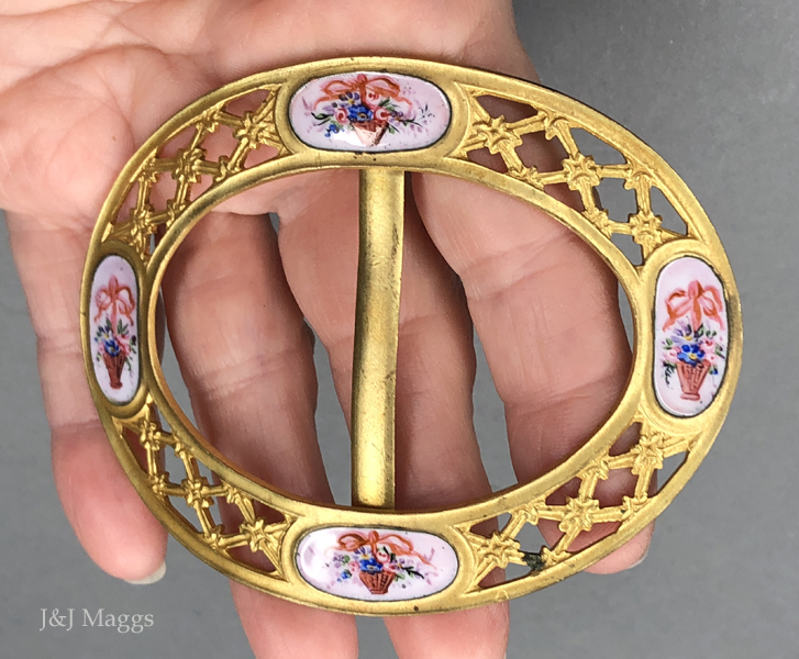 A beautiful French enameled gilt buckle in lovely condition, measuring 3 ½” wide, 2 ¾” high. An oval decorative, pierced design, with a central flat bar for fabric. There are four enameled cartouches of floral arrangements in ribboned baskets. French, 19th century.
