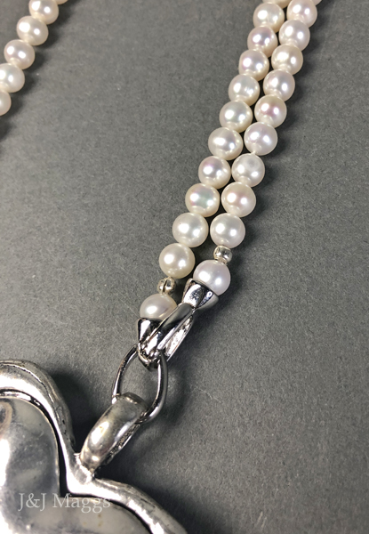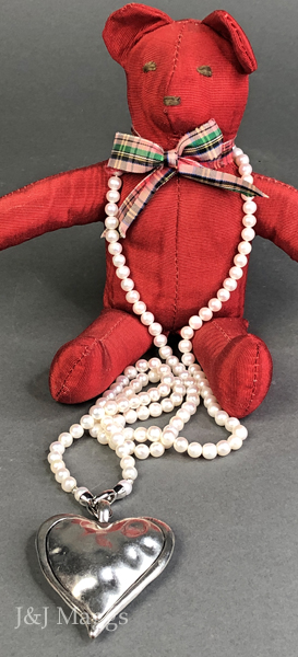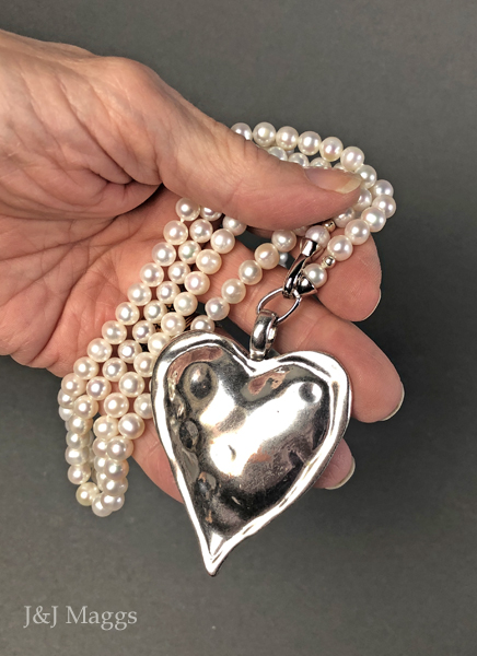 A long (33”) strand of white, freshwater pearls (6mm), with a large sterling silver heart pendant (2 ½” top to bottom x 2” wide), which may be worn in various ways. Both ends of the strand have snap clasps to allow varied styling, by removing the heart, or adding your own drops and charms. Most likely contemporary, and great fun.
