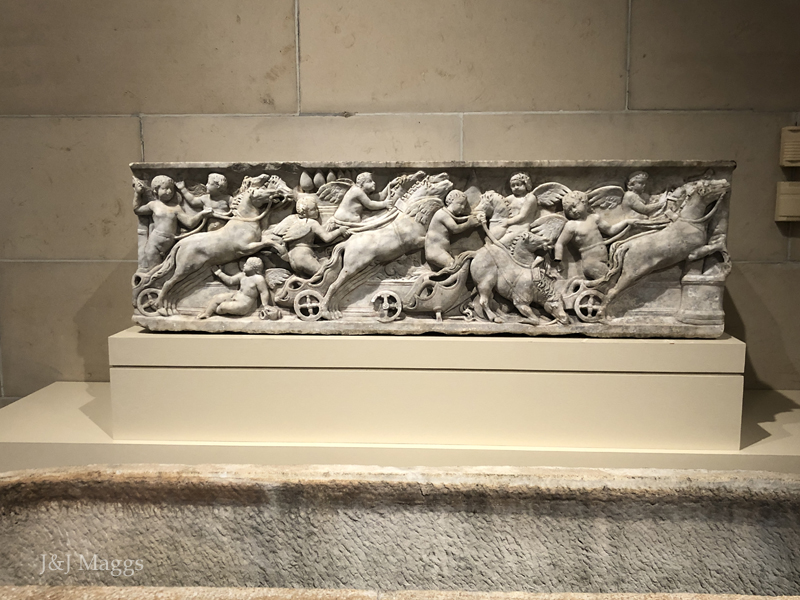 A marble sarcophagus with cupids racing chariots in the Circus Maximus