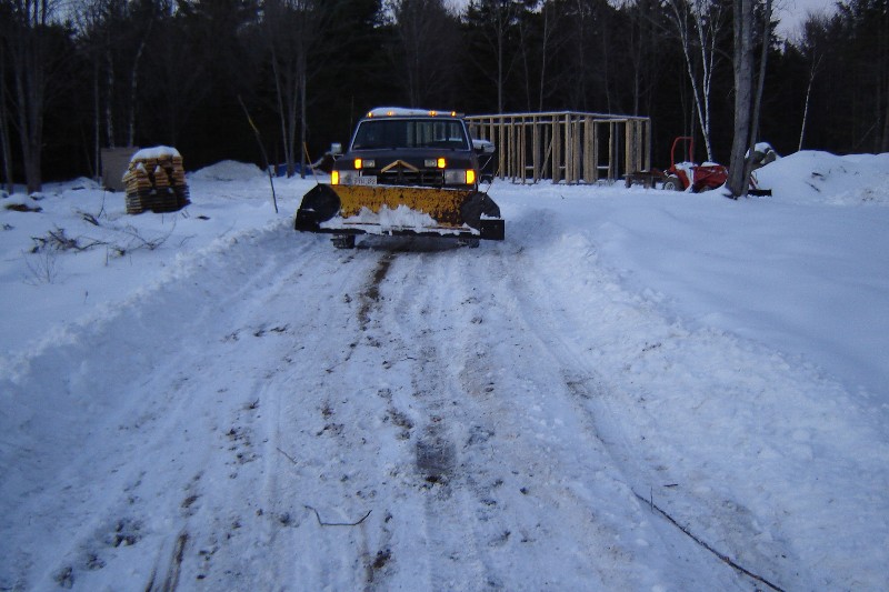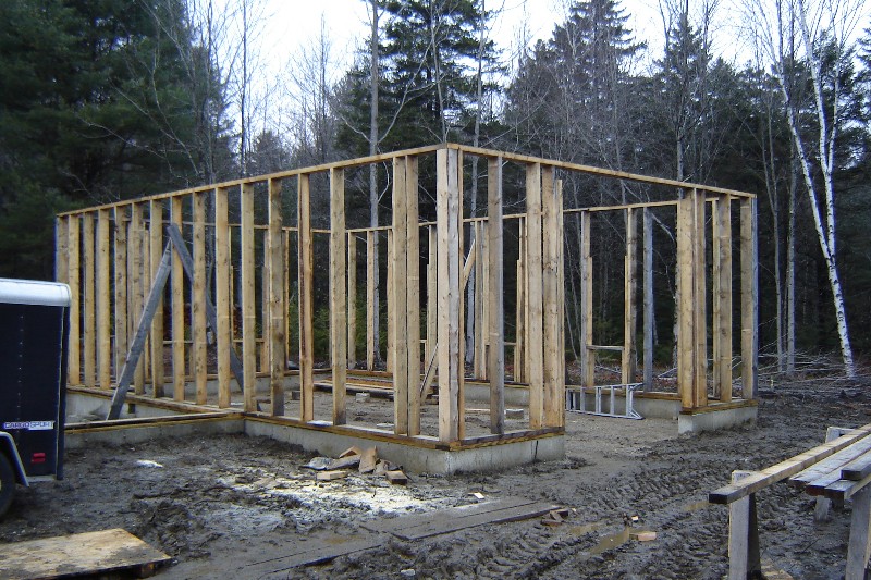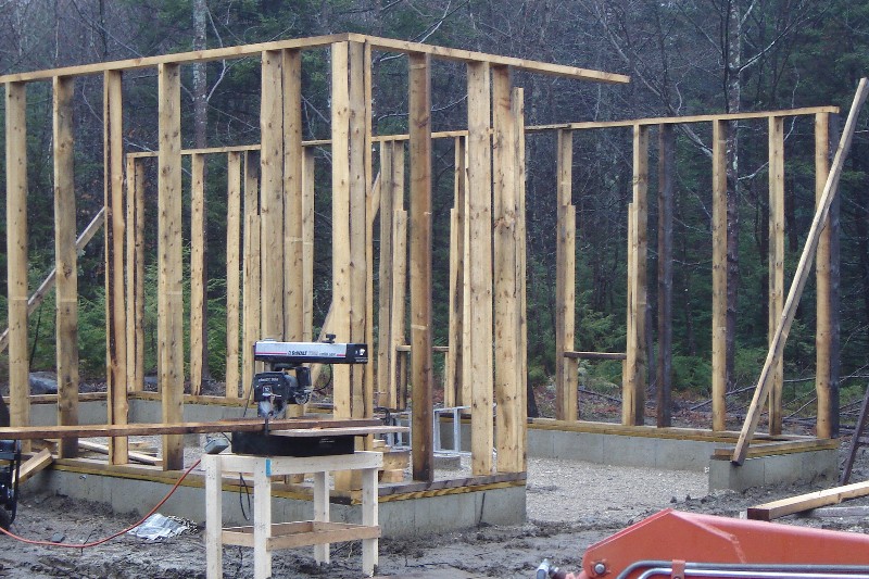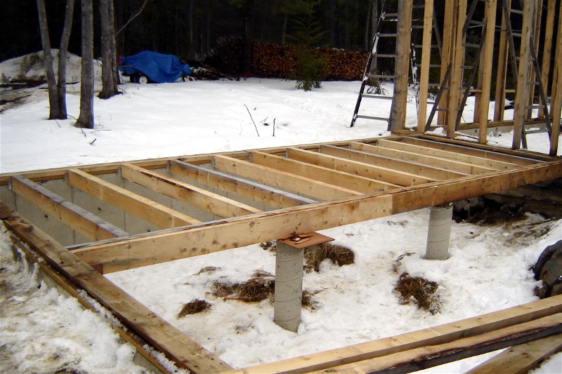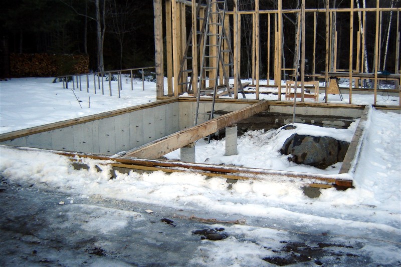 Although the first floor of the barn had been framed, we were still faced with an open foundation under our proposed shop. Knowing that winter temperatures would certainly compromise the unprotected concrete walls, we filled the hole with mulch hay for insulation, then began to cap it. We first built a large girder from end to end, supported by two cement columns.