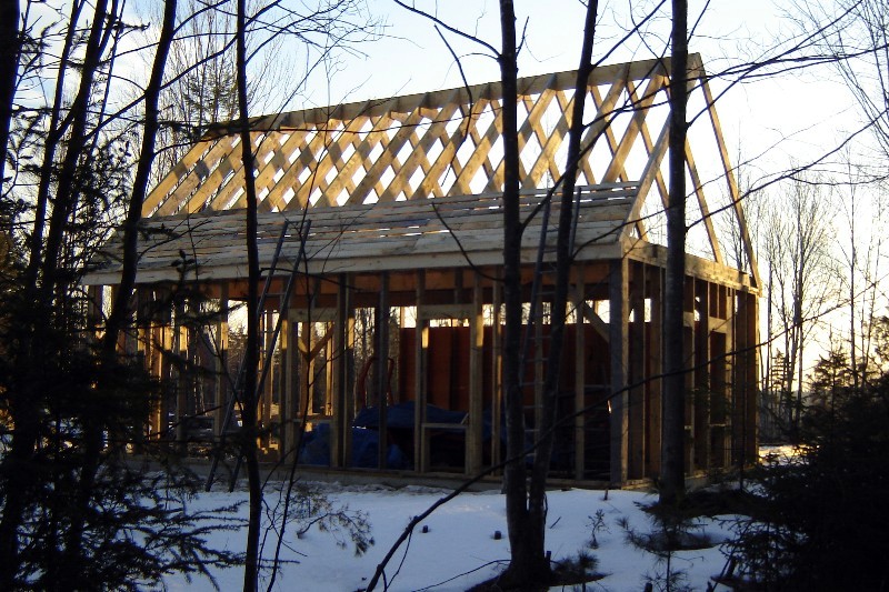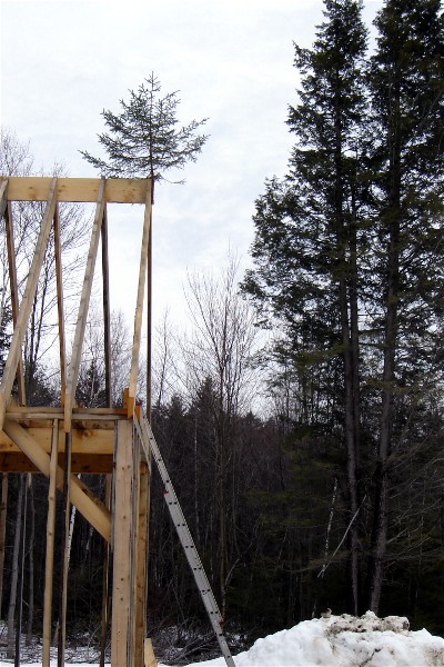 As evening approached on February 4, we nailed a hemlock sapling to the ridge. The barn that we had planned to complete during the preceding summer was at last framed!