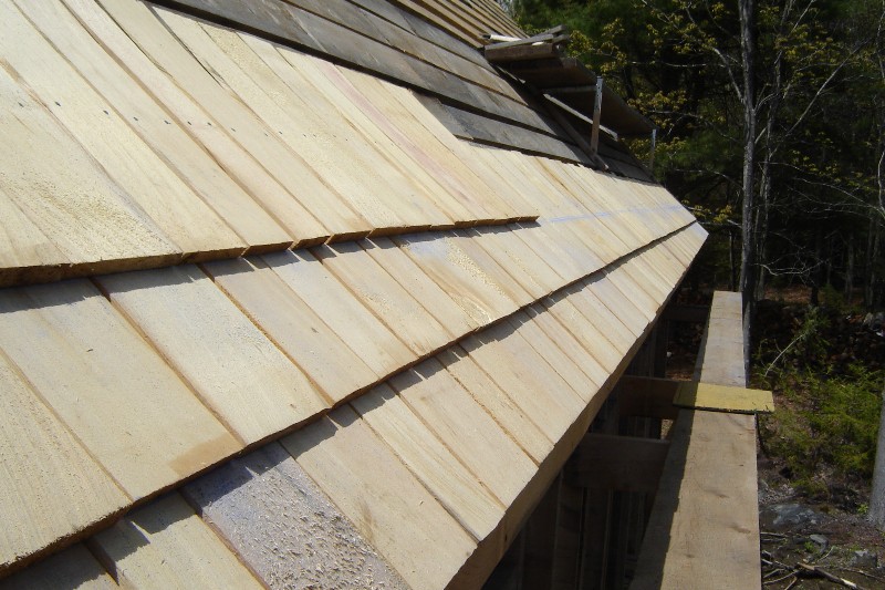 Back at the top, we began applying white cedar shingles to the roof on May 18th and finished the east side on the 21st.