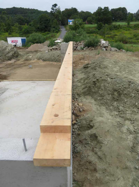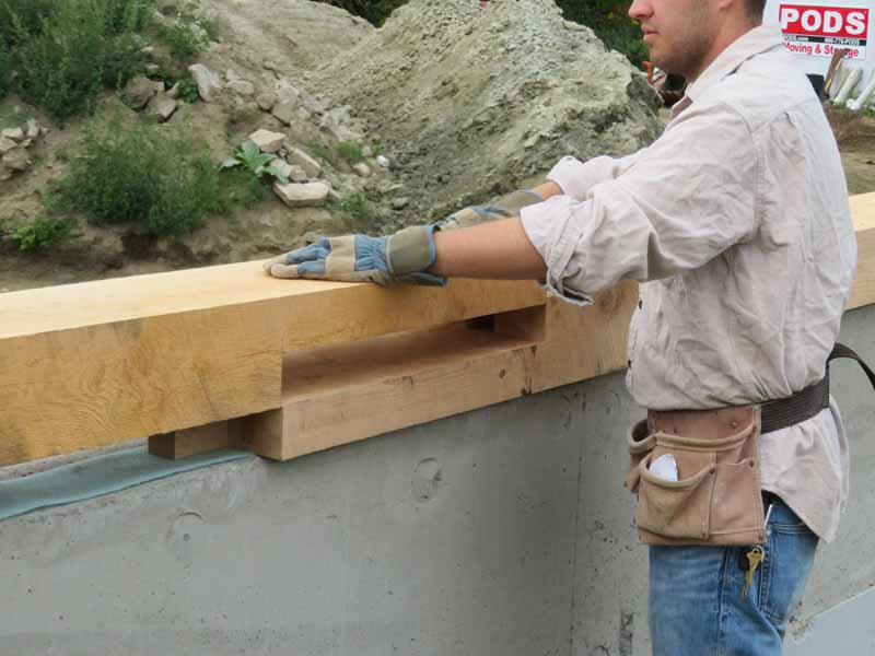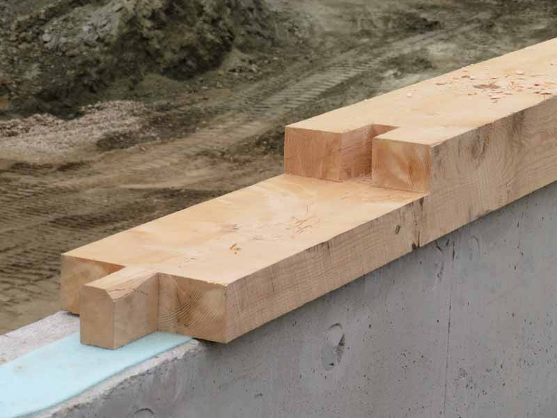 One of the tenoned lap joints that will make the sills perfectly rigid sits on the foundation.