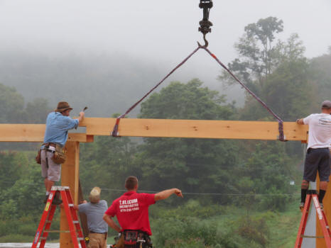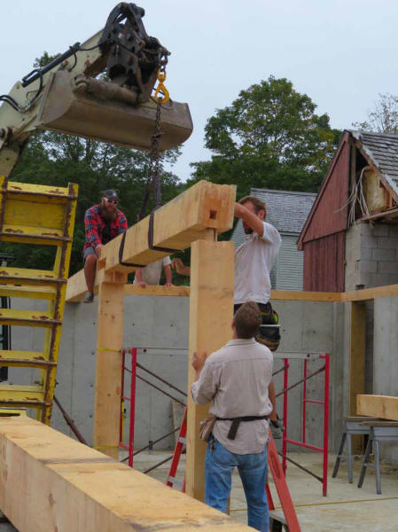 Then, one by one, the three beams that frame the west wall of the lean-to were put in place.