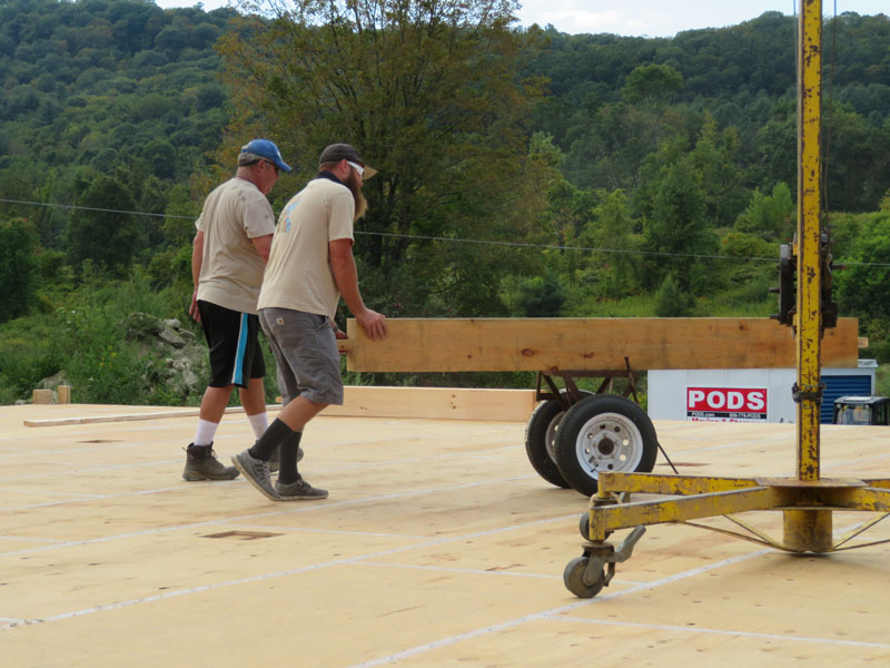 The crew used Jesse's tractor to gently carry the timbers to the deck -