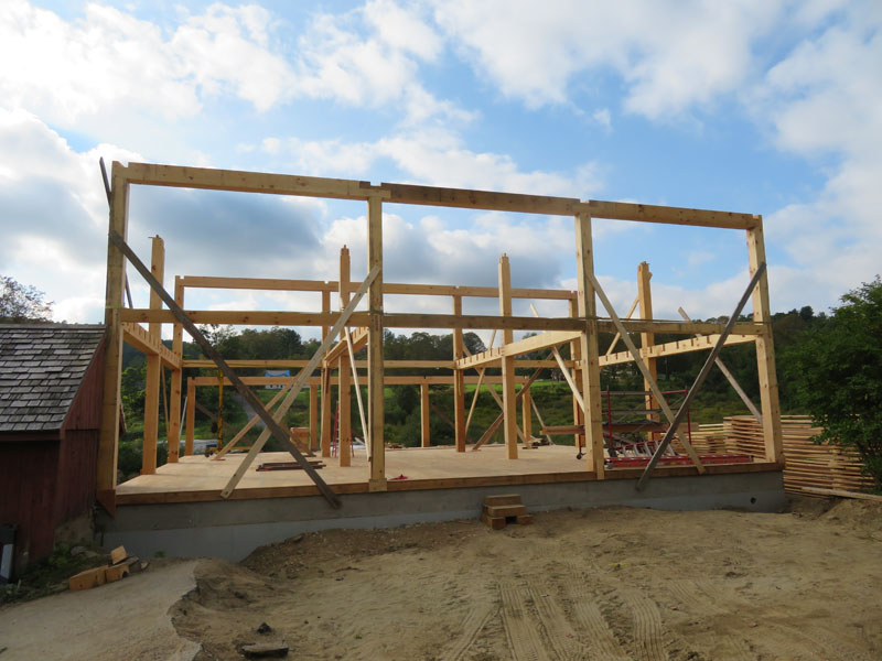 The sills and floor beams are complete; many of the floor joists are installed.