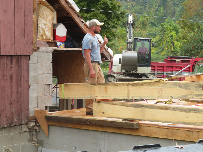 Jesse speaking with the operator who delivered the Douglas fir 2X12s that will support the roof