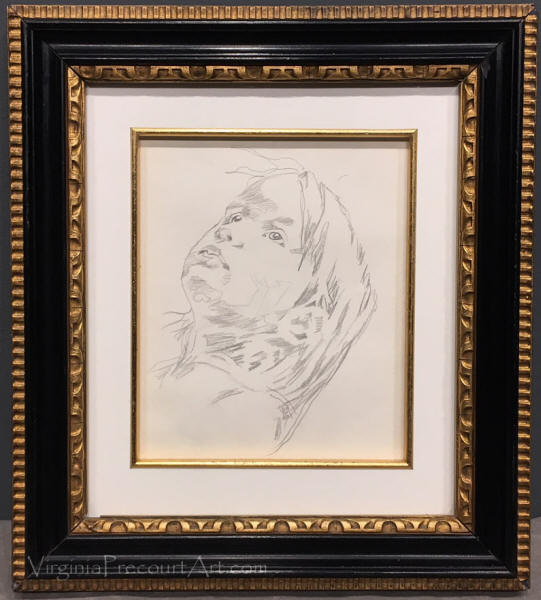 Studies for "Garden Parties" For 30 years, beginning in the mid-’70s, Virginia Strom Precourt had a clear vision of a celebration of the youth, color, and energy of the Boston Public Garden. The focal point would be a young woman sitting on the edge of a bridge that interrupts the path from Arlington Street to Charles Street. Early on, she found the right posture for that individual, but kept changing out her clothes, her expression, even her face. A series of pencil drawings that carry the “Garden Party” theme was created at different times and demonstrated that she never wanted to move too far from what she had hoped would be her richest work. Characters who she wanted to join the Garden Party would come to mind and she’d interrupt whatever else she was doing to capture them on paper. She would describe her vision for this master work in specific terms, but never committed to a formal design. It always was a work in progress.