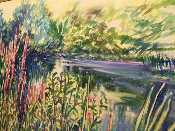 Whether it was the dirt road alongside the pond that adjoined her Dover, Massachusetts studio, a dock in a fishing village in midcoast Maine, or a quiet spot on the water’s edge in France’s Bay of Biscay, Virginia Strom Precourt found the energy and vision that would inform her art. “Silent Reflections” was drawn almost directly from the sketchpad she had carried on a quiet afternoon stroll along an isolated coastline in Vendee.
